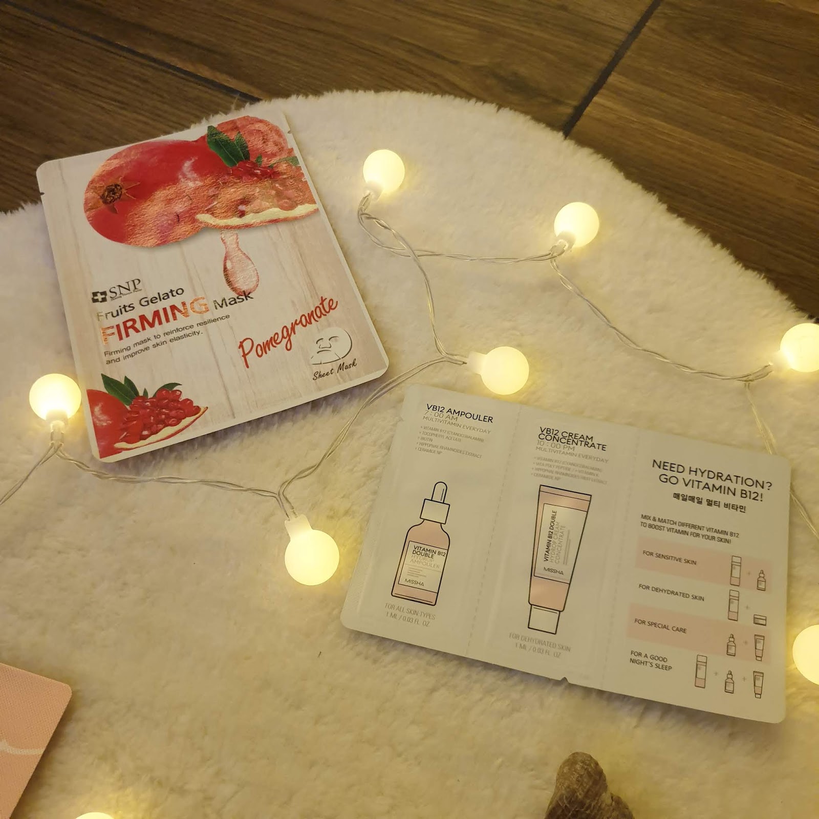 Im Paket ist das Missha super off cleansing Oil. Es ist sanft zur Haut und hat bei mir das Make up problemlos entfernt. Die Missha Pure Source Cell Sheet Mask. Die Maske gibt es für verschiedene Bedürfnisse. Meine ist die Aloe Maske. Die Maske fühlt sich erst kühl auf der Haut an und im Anschluss weich und gut versorgt. Die SNP fruits Gelato firming Mask mit Granatapfel. Die Maske ist ebenfalls eine Tuchmaske. Der Duft ist fruchtig frisch und auf meiner Haut war die Maske gut verträglich.